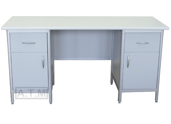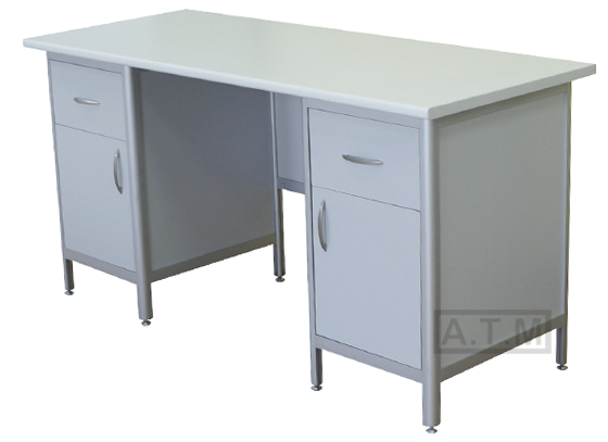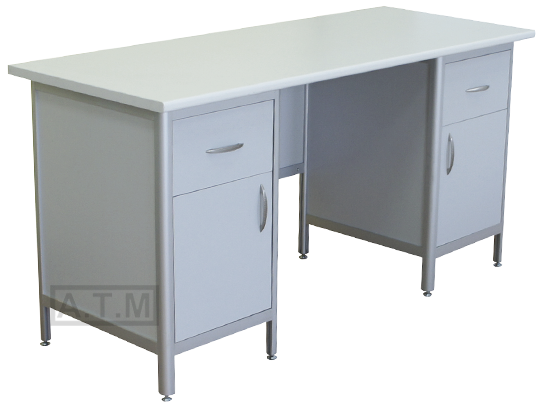 Стол снабжен двумя тумбами с одним ящиком на роликовых направляющих и створкой (за створкой полка);