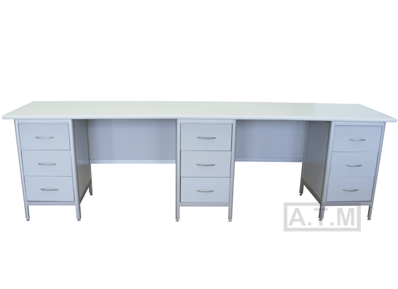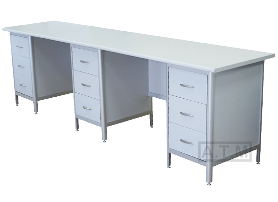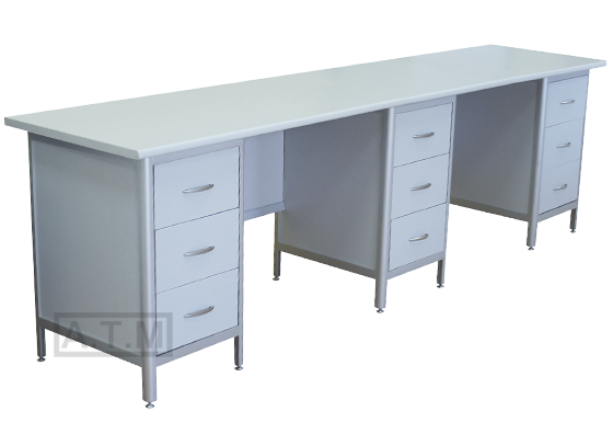 Стол снабжен 3 тумбами с 3 ящиками на роликовых направляющих;