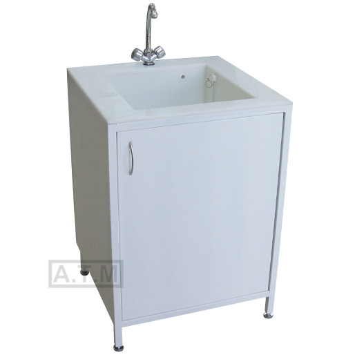 Мойка снабжена одной створкой, смесителем с подводом для горячей и холодной воды.;
