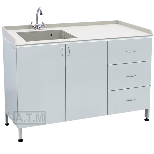 Столешница толщиной 10 мм выполнена из полипропилена серого цвета, по трем сторонам антипроливные бортики;