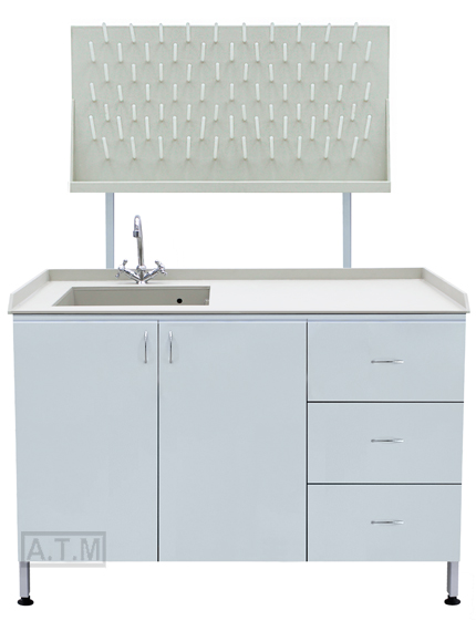 Столешница толщиной 10 мм выполнена из полипропилена серого цвета, по трем сторонам антипроливные бортики;