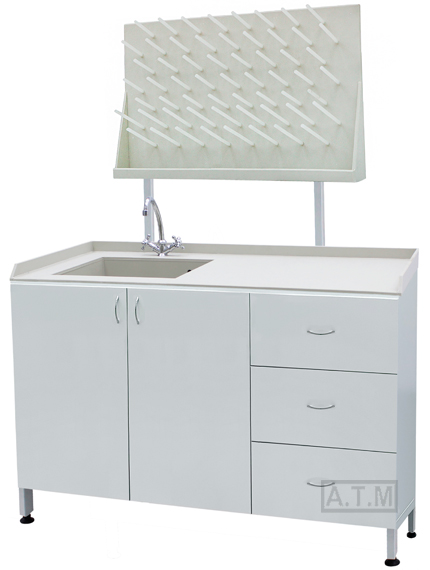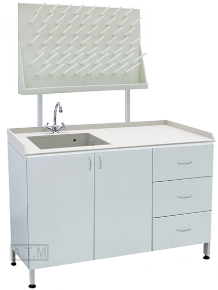 Столешница толщиной 10 мм выполнена из полипропилена серого цвета, по трем сторонам антипроливные бортики;