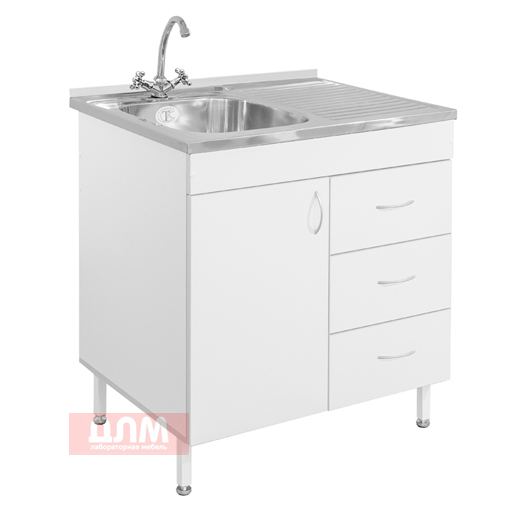Мойка снабжена створкой, тремя ящиками, мойкой с крылом из нержавеющей стали, а также краном и сифоном.