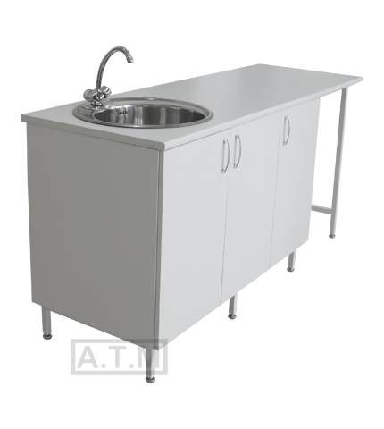 Мойка снабжена 3 створками. За правой створкой — полка, смесителем с подводом для горячей и холодной воды и сифоном.