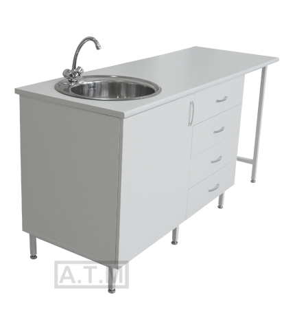 Мойка снабжена створкой и 4-я ящиками на роликовых направляющих, смесителем с подводом для горячей и холодной воды и сифоном.