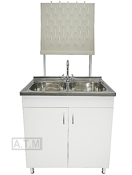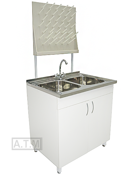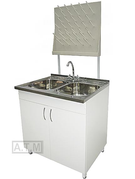 Мойка снабжена двумя створками, мойкой с двумя чашами, сушильным стеллажом из полипропилена серого цвета, смесителем с подводом для горячей и холодной воды и сифоном.