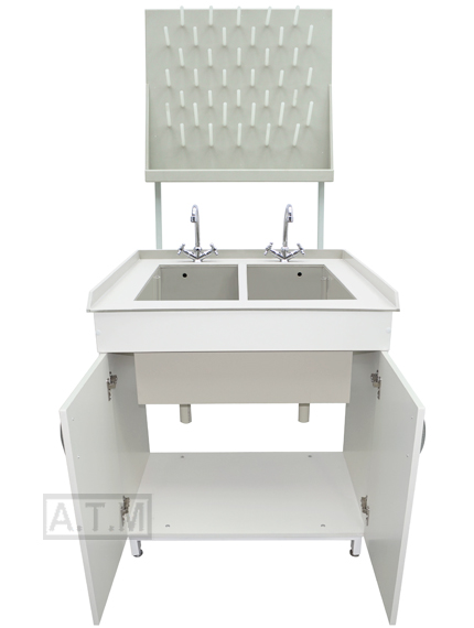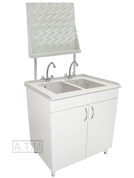 Мойка снабжена двумя створками, мойкой с двумя чашами, смесителем, сушильным стеллажом из полипропилена серого цвета, смесителем с подводом для горячей и холодной воды;