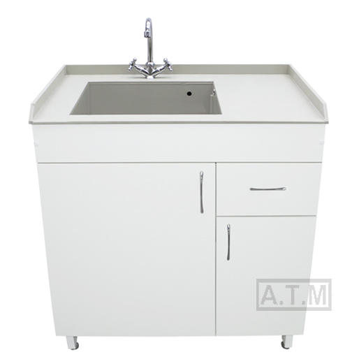 Столешница толщиной 10 мм выполнена из полипропилена серого цвета, по трем сторонам антипроливные бортики;
