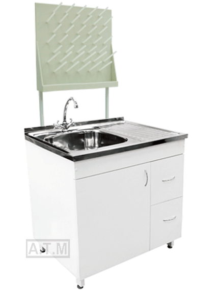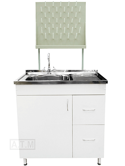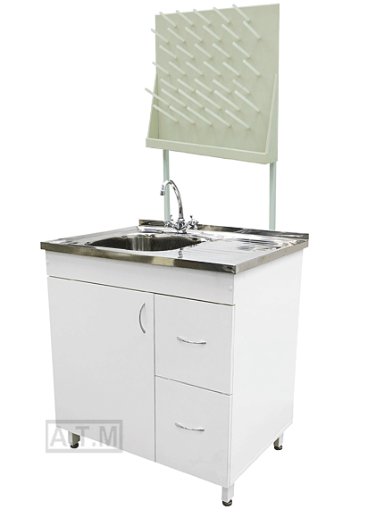 Мойка снабжена створкой, 2-мя ящиками на роликовых направляющих, мойкой с крылом, сушильным стеллажом из полипропилена серого цвета, смесителем с подводом для горячей и холодной воды и сифоном.