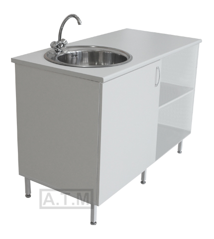 Мойка снабжена створкой, полкой с правой стороны и смесителем с подводом для горячей и холодной воды и сифоном.