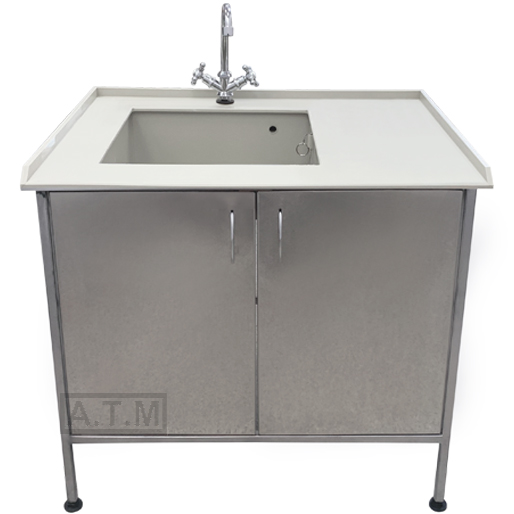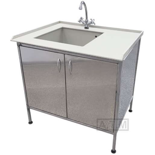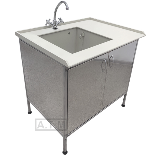 Столешница толщиной 10 мм выполнена из полипропилена серого цвета, по трем сторонам антипроливные бортики;