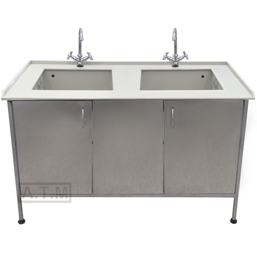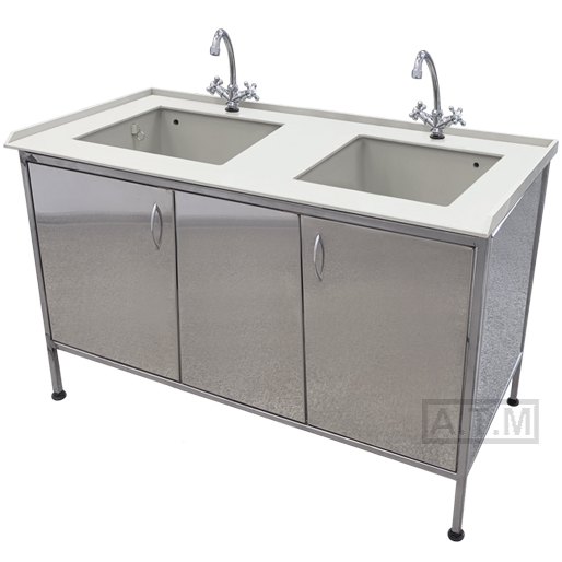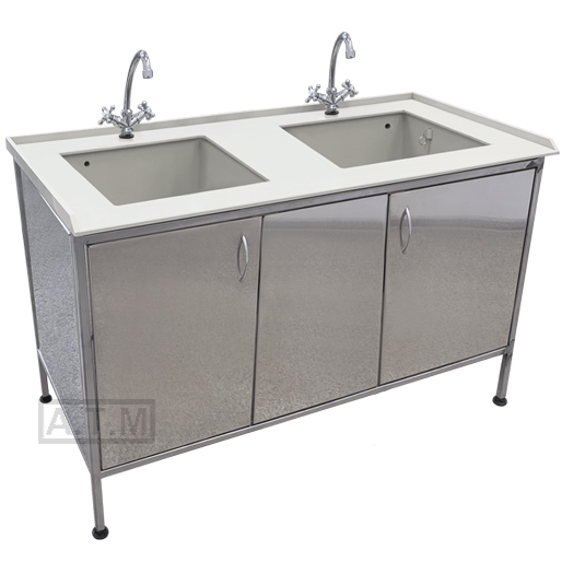 Мойка снабжена двумя створками, двумя смесителями с подводом для горячей и холодной воды, двумя заглушками с хромированной цепочкой для раковины.