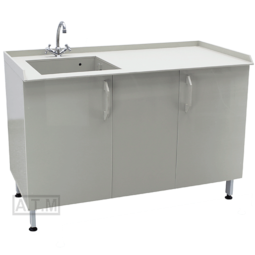 Столешница толщиной 10 мм выполнена из полипропилена серого цвета, по трем сторонам антипроливные бортики;