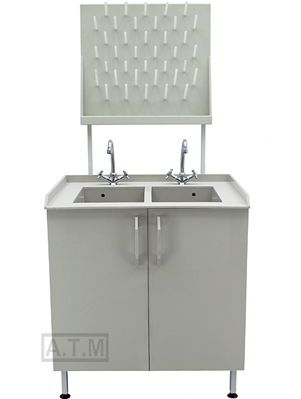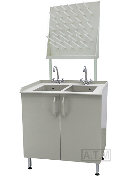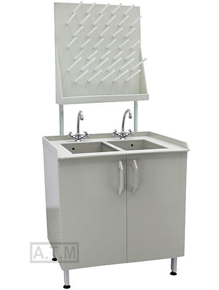 Мойка снабжена двумя створками,смесителем с подводом для горячей и холодной воды.