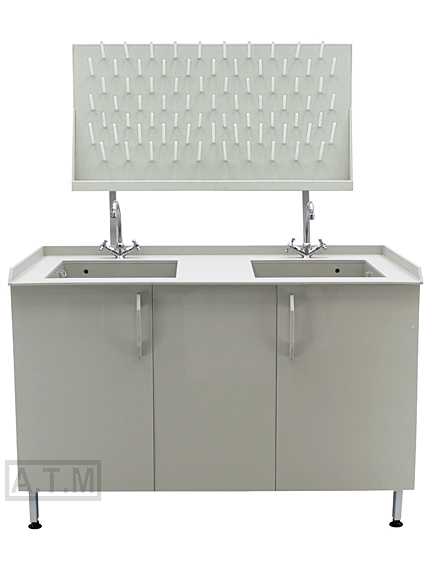 Столешница толщиной 10 мм выполнена из полипропилена серого цвета, по трем сторонам антипроливные бортики;
