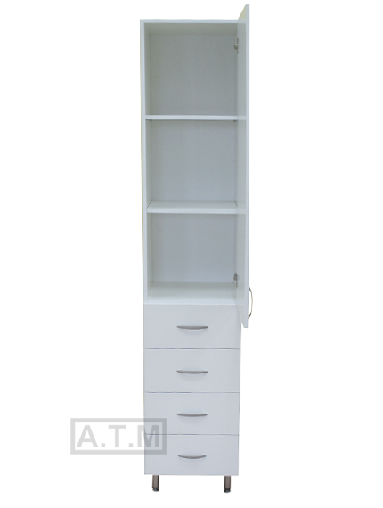 Шкаф комплектуется створкой (верхняя часть) и 4-я ящиками на роликовых направляющих;