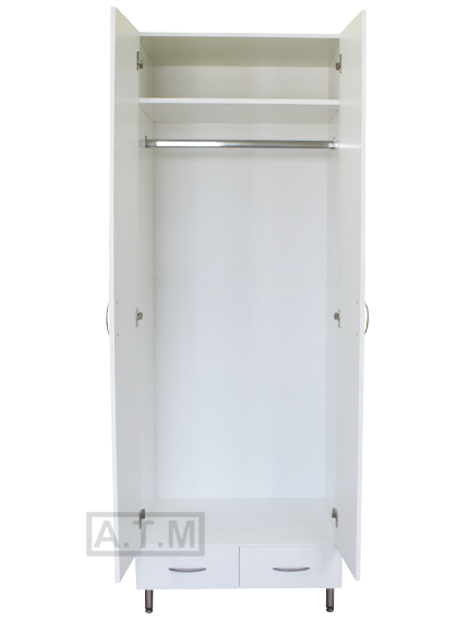 За дверкой : полка для головных уборов, штанга для вешалок;
