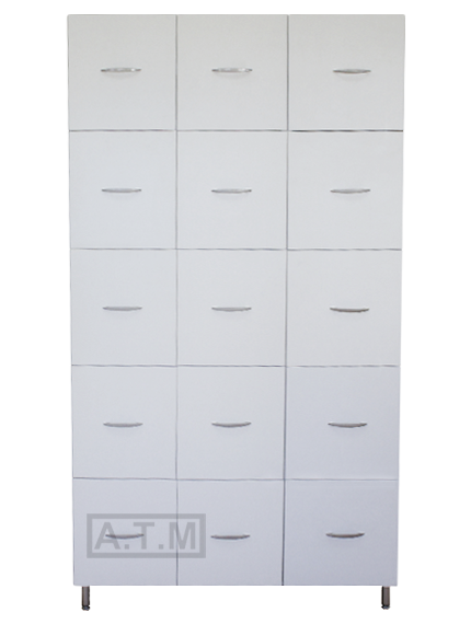 Имеет 15 выдвижных ящиков, на роликовых направляющих;