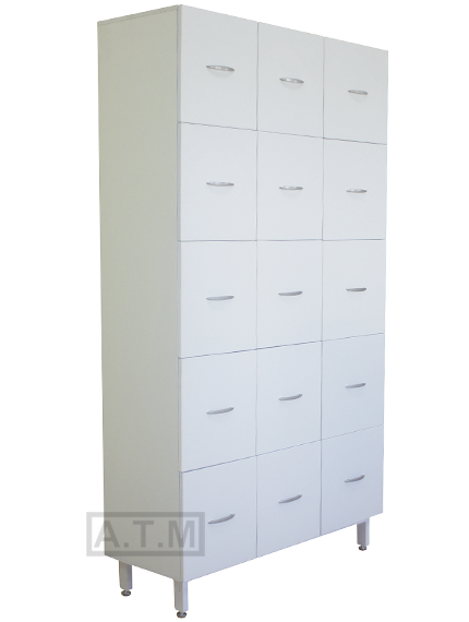 Имеет 18 выдвижных ящиков, на роликовых направляющих;