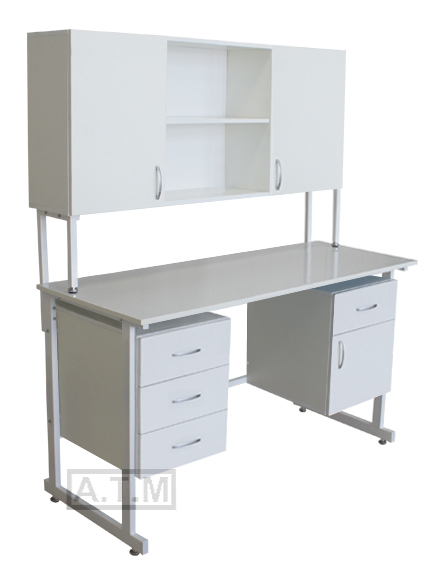 Стол снабжен надстройкой (две створки и полки) и двумя тумбами;
