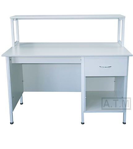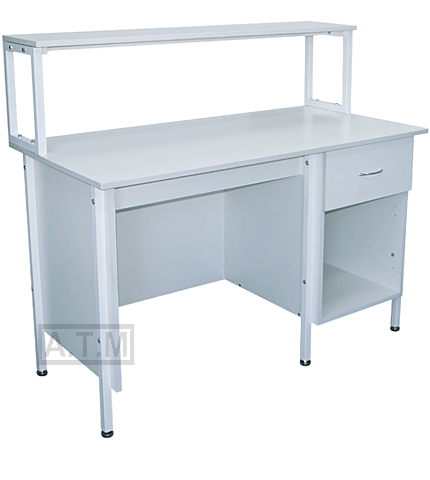 Стол оснащен тумбой с ящиком на роликовых направляющих и нишей;