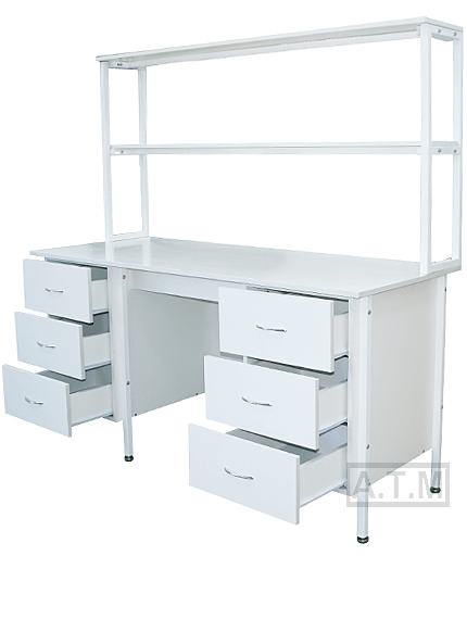 Стол оснащен 2 тумбами с 3 ящиками на роликовых направляющих;