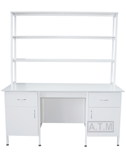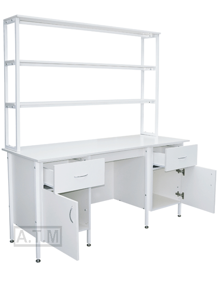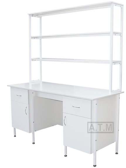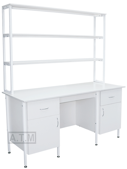 Стол снабжен надстройкой с тремя полками;