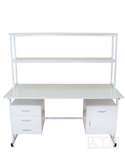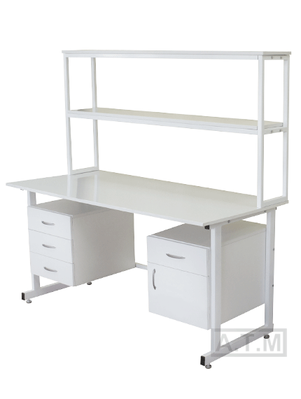 Стол снабжен надстройкой с 2 полками, 2 розетками, автоматом отключения питания на 16А и светодиодным светильником;