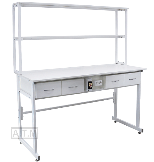 Стол снабжен надстройкой с двумя полками;