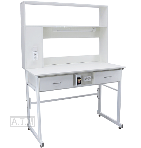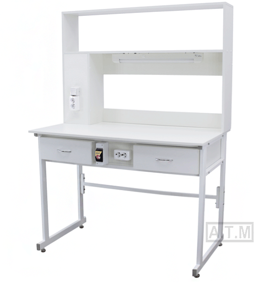 Стол снабжен надстройкой с 2 полками, 2 розетками и светодиодным светильником
