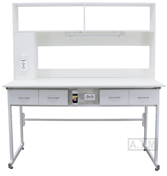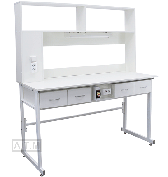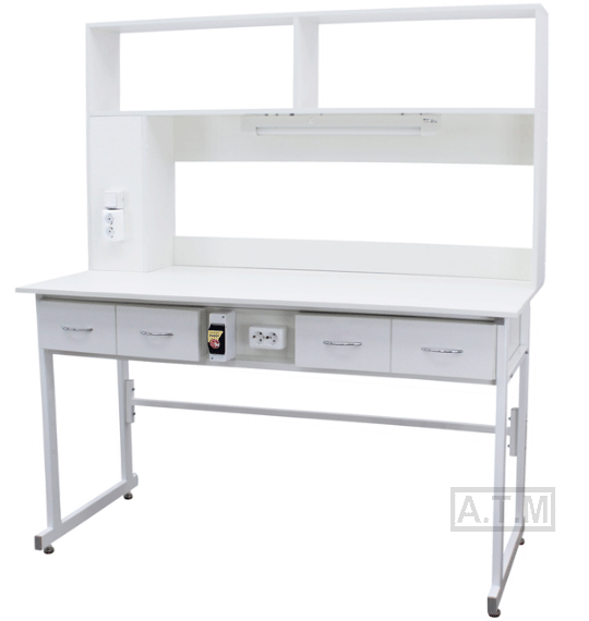 Стол снабжен надстройкой с 2 полками, 2 розетками и светодиодным светильником;