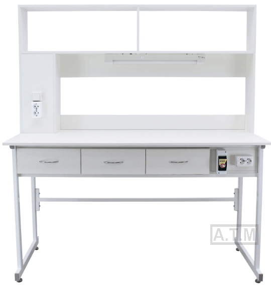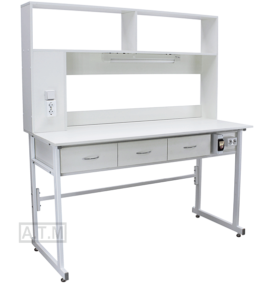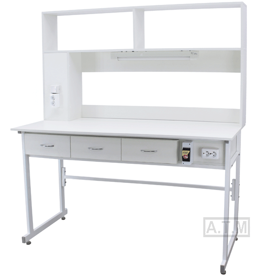 Стол снабжен надстройкой с 2 полками, 2 розетками и светодиодным светильником;