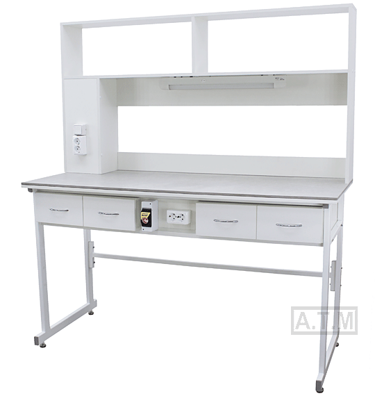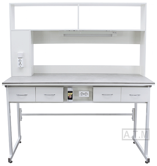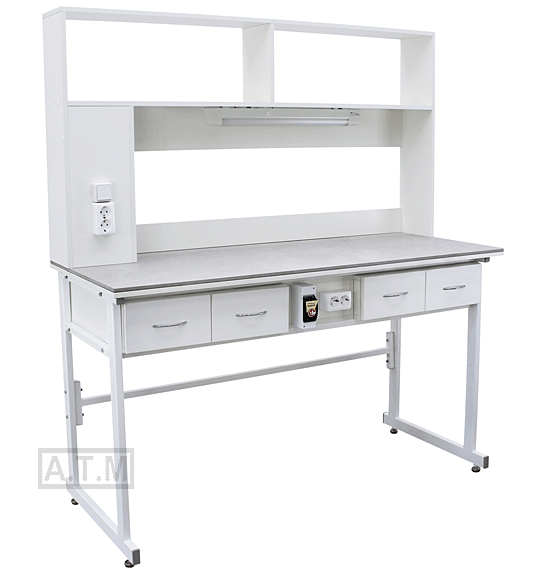Стол снабжен надстройкой с 2 полками, 2 розетками и светодиодным светильником;