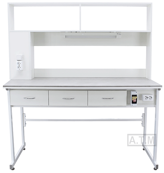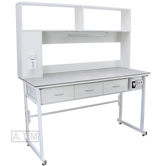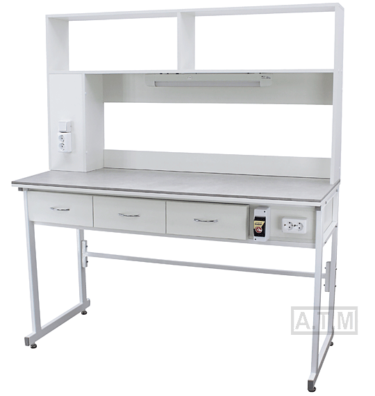 Стол снабжен надстройкой с 2 полками, 2 розетками и светодиодным светильником;