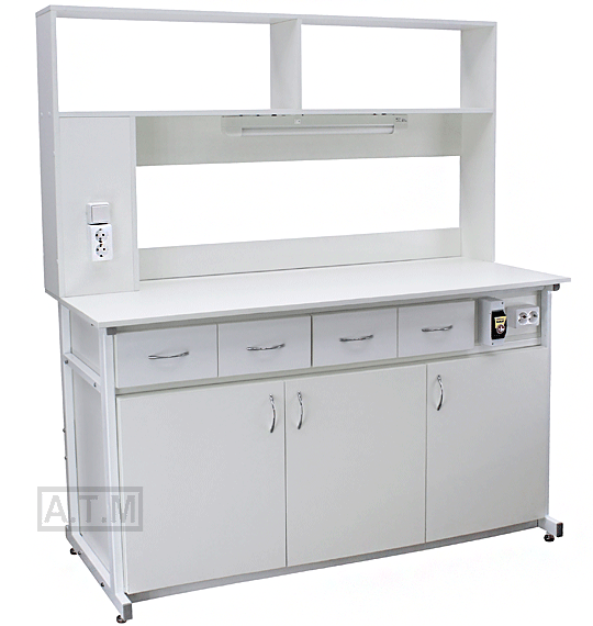 Стол снабжен надстройкой с 2 полками, 2 розетками и светодиодным светильником;