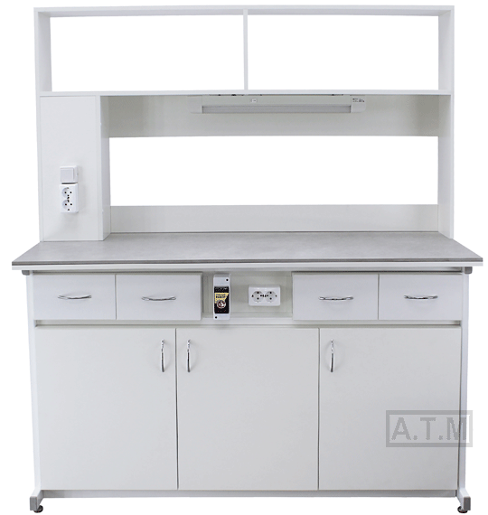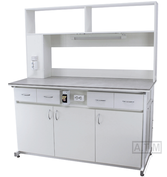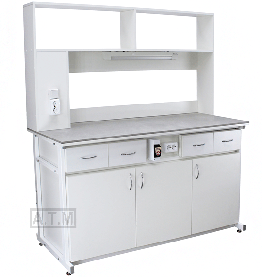 Стол снабжен надстройкой с 2 полками, 2 розетками и светодиодным светильником;