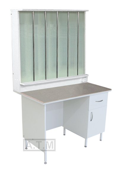 Стол снабжен розеткой, выключателем и тумбой с ящиком и створкой;