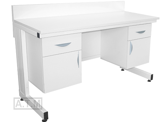 Стол оснащен 2 тумбами, каждая тумба имеет ящик и распашную дверцу;