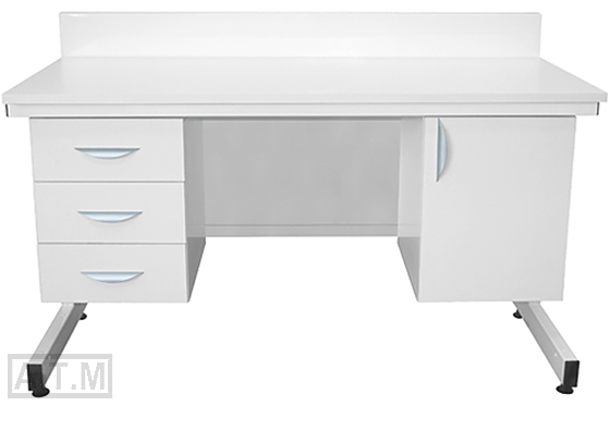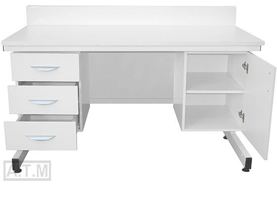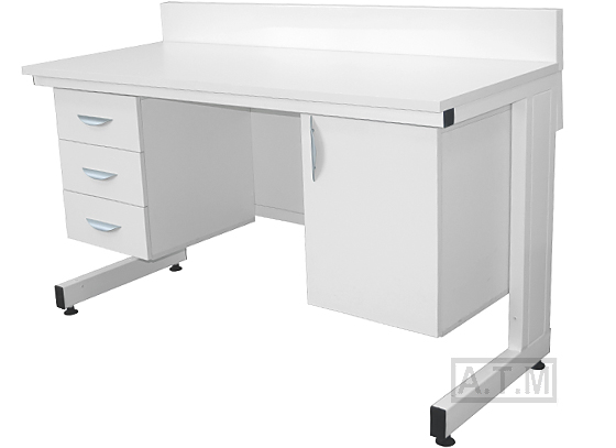 Стол оснащен 2 тумбами, первая тумба имеет 3 ящика на роликовых направляющих, вторая - распашную дверцу;