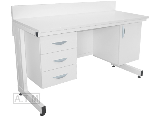 Стол оснащен 2 тумбами, первая тумба имеет 3 ящика на роликовых направляющих, вторая — распашную дверцу;