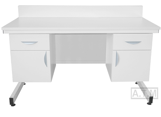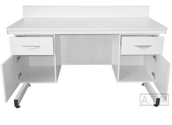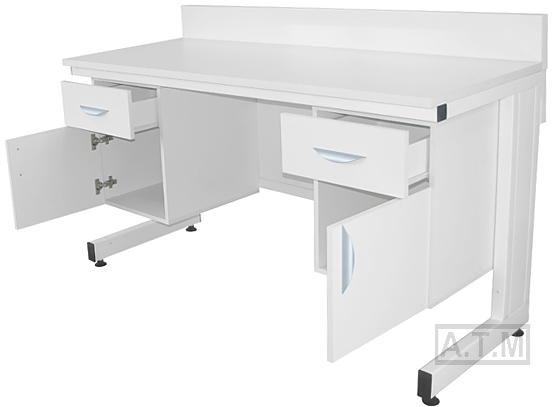 Стол оснащен 2 тумбами, каждая тумба имеет ящик и распашную дверцу;