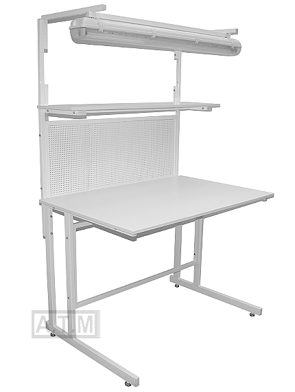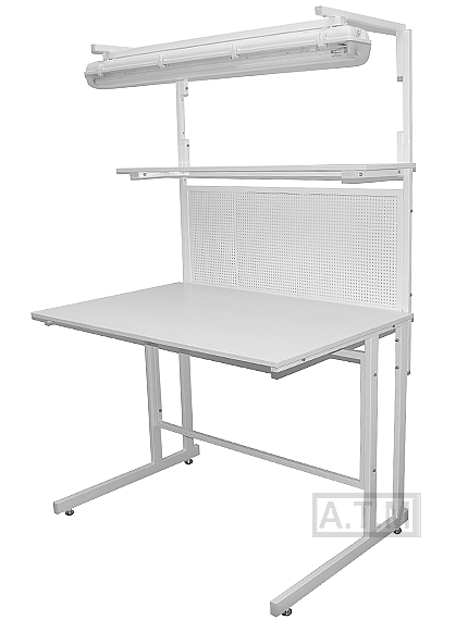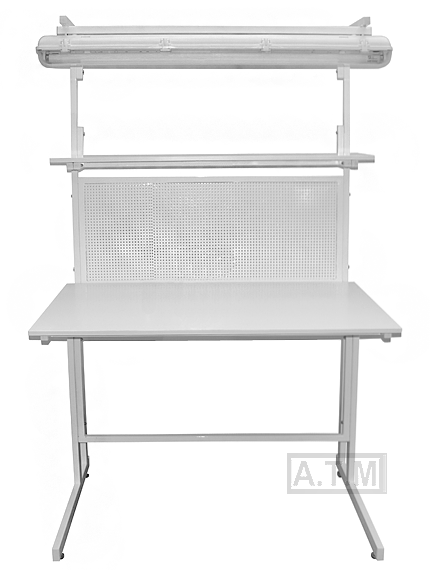 Стол снабжен надстройкой с одной полкой, светодиодным светильником, розеткой, автоматом отключения питания на 16А, металличекой перфорированной панелью.