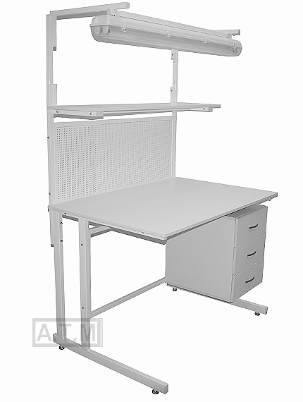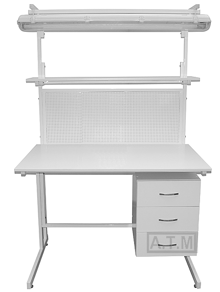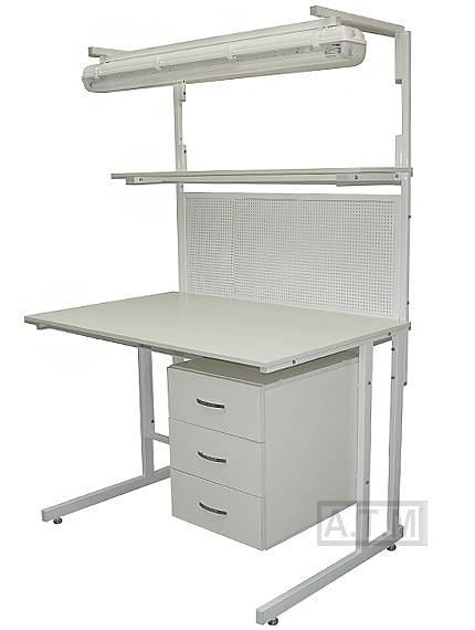 Стол снабжен надстройкой с одной полкой, светодиодным светильником, розеткой, автоматом отключения питания на 16А, металличекой перфорированной панелью.