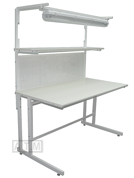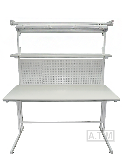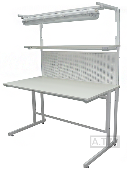 Стол снабжен надстройкой с одной полкой, светодиодным светильником, розеткой, автоматом отключения питания на 16А, металличекой перфорированной панелью.