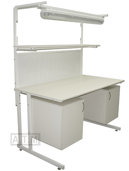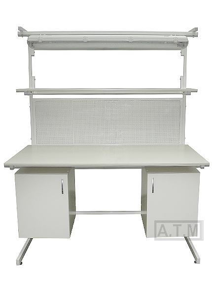 Стол снабжен надстройкой с одной полкой, светодиодным светильником, розеткой, автоматом отключения питания на 16А, металличекой перфорированной панелью.