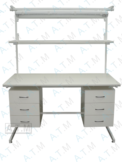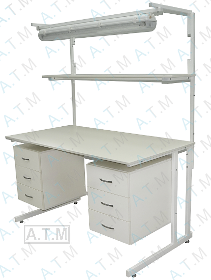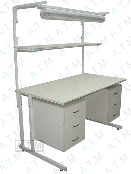 Стол снабжен надстройкой с одной полкой, светодиодным светильником, розеткой, автоматом отключения питания на 16А;
