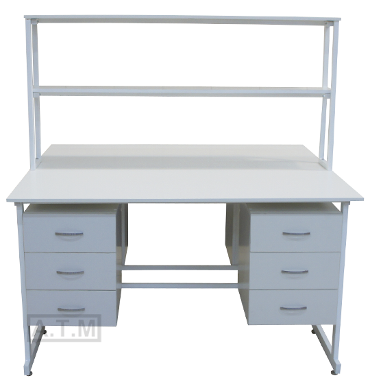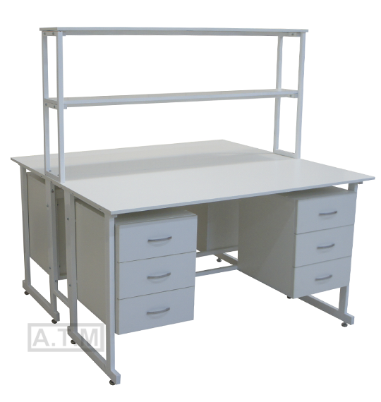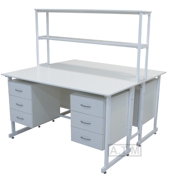 Стол снабжен надстройкой с двумя полками;