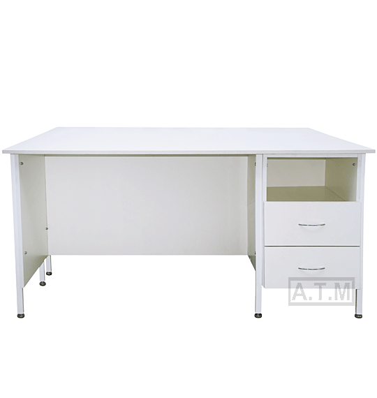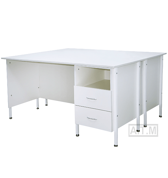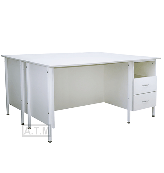 Стол оснащен тумбой с 2 ящиками на роликовых направляющих и нишей;