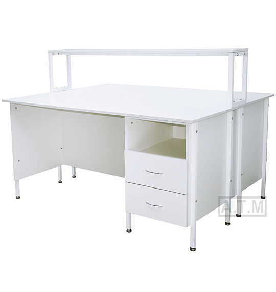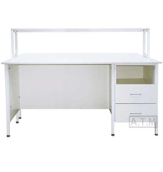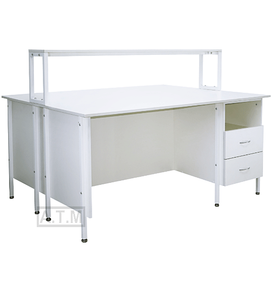 Стол оснащен тумбой с 2 ящиками на роликовых направляющих и нишей;