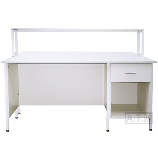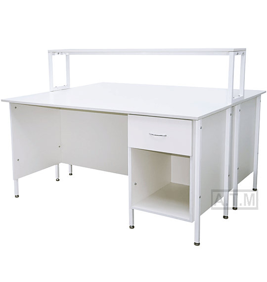 Стол оснащен тумбой с ящиком на роликовых направляющих и нишей;